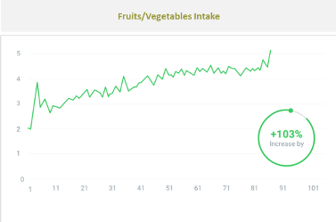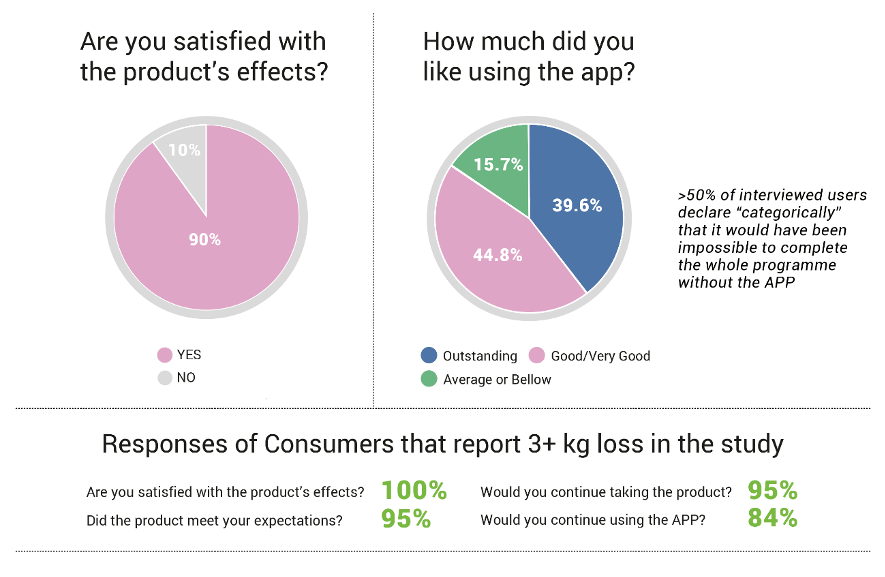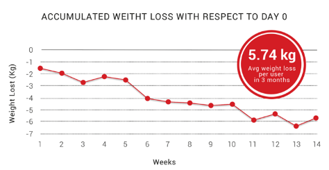 As for the introduction of new behavioral habits, we were able to detect a noticeable increase. For example, users reported increasing over twice-fold the amount of fruits, vegetables and water that they took daily, and increased over 50% the amount of physical activity performed weekly. Overall, over 85% of the users reported significant weight loss thanks to the combined solution, with an average of almost 6kg lost in 90 days.