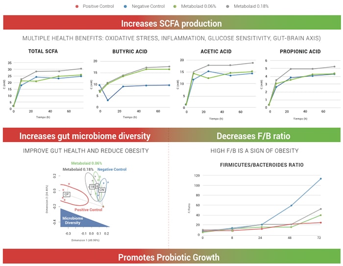 Another assessment performed was with regard to the Firmicutes/Bacteroidetes ratio (F/B). Firmicutes and Bacteroidetes are two major bacterial phyla present in the gut, and in obesity this ratio is high. The results showed that Metabolaid contributed to decreasing the F/B ratio, particularly at 48 and 72 hours after consumption. Therefore, Metabolaid´s weight management effects could be attributed not only due to its direct interaction with target organs such as the fat, liver and muscles, but also indirectly through gut microbiome modulation towards a population more similar to that found in healthy weight individuals.